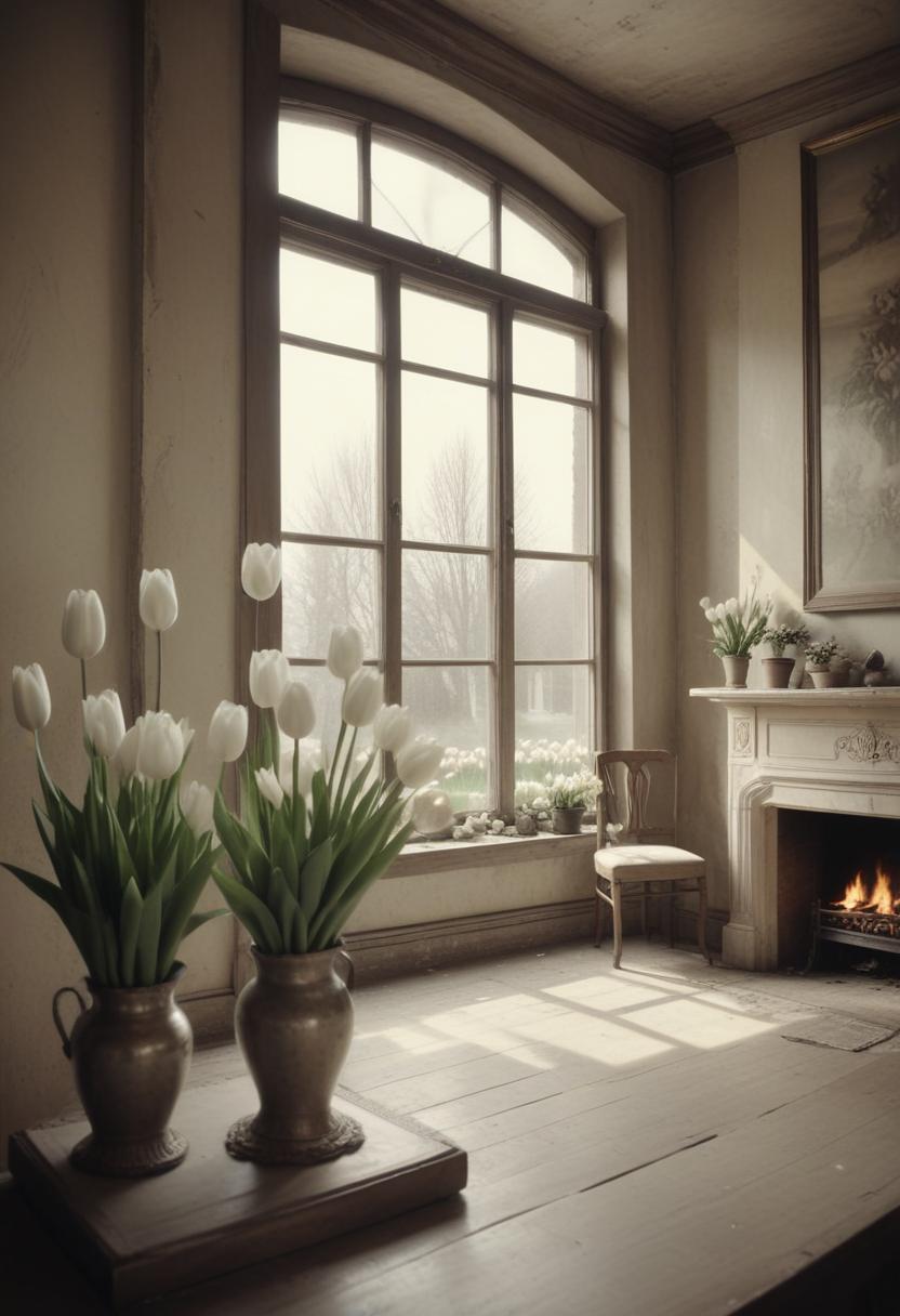 A cozy interior features white tulips on display with sunlight streaming through large windows. A charming fireplace adds to the atmosphere.