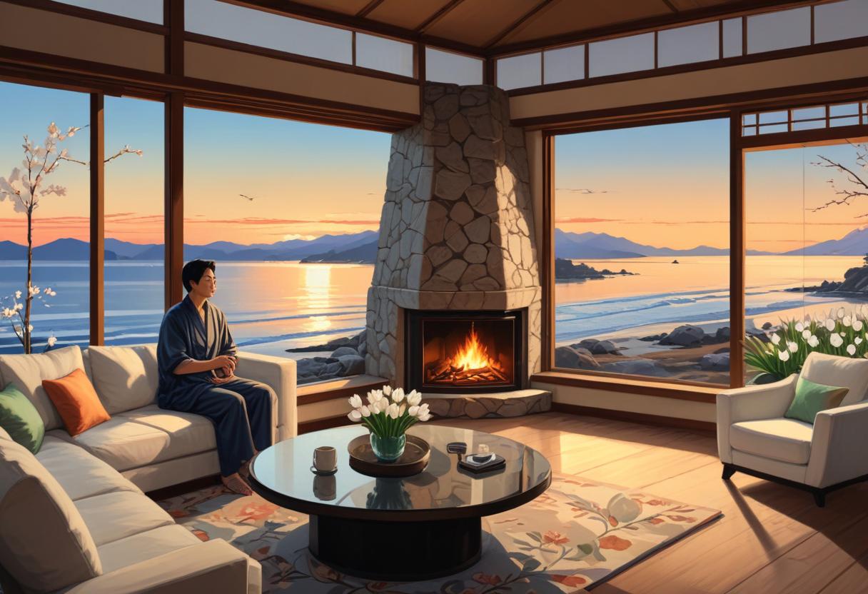 Cozy evening by the fireplace with ocean view
