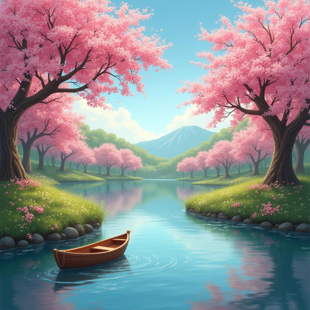 A wooden boat glides on a calm river surrounded by blooming cherry blossom trees under a clear blue sky in springtime.