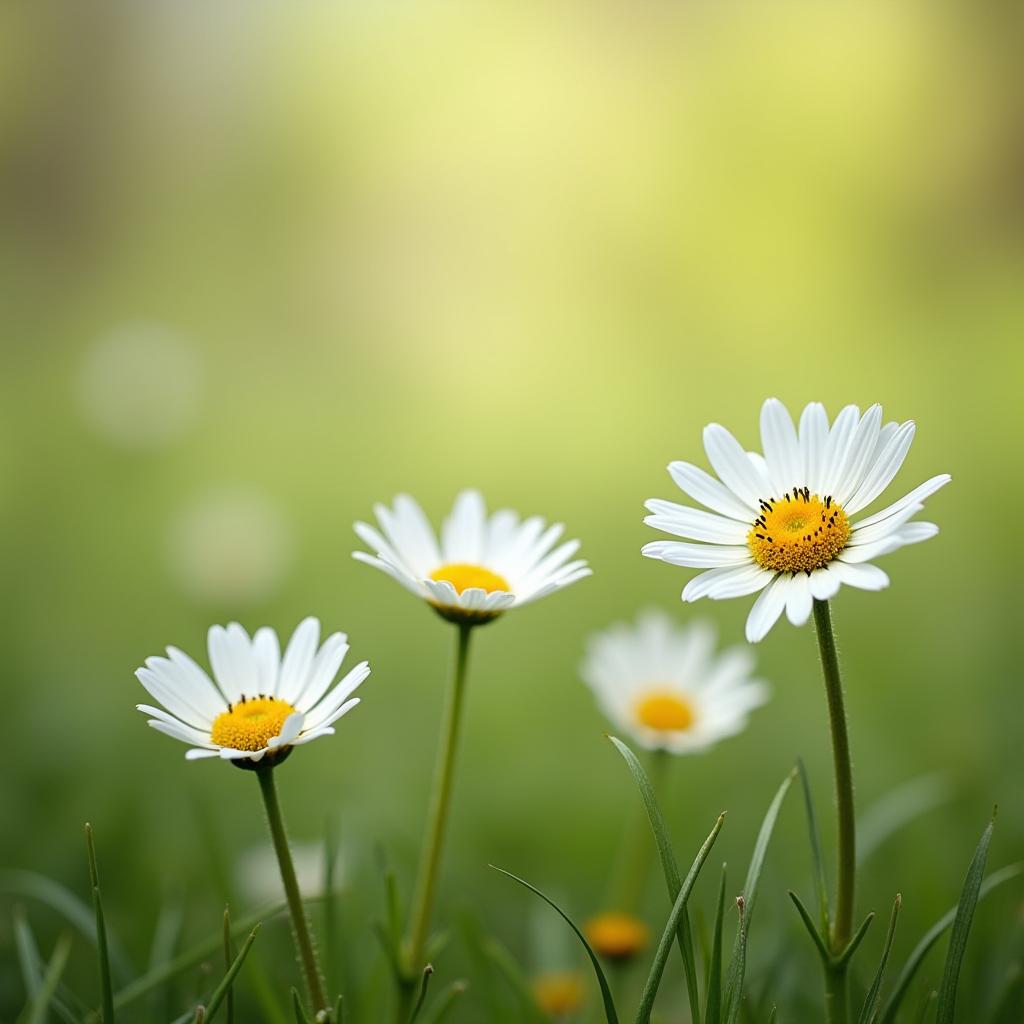 Four white daisies with yellow centers are blooming in a lush green meadow on a bright spring day, showcasing nature's beauty and freshness.