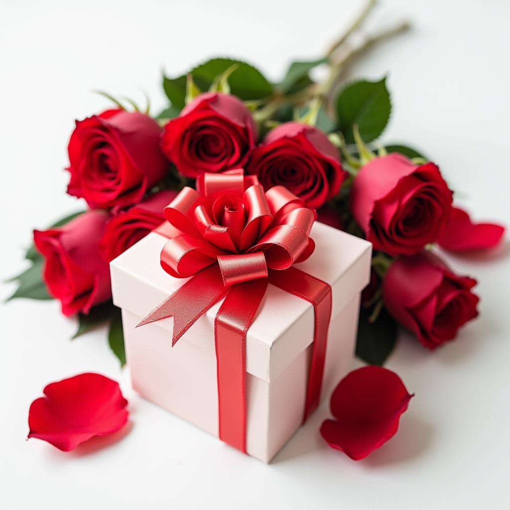 Vibrant red roses surround an elegantly wrapped gift box, perfect for celebrating love or appreciation on a memorable day.
