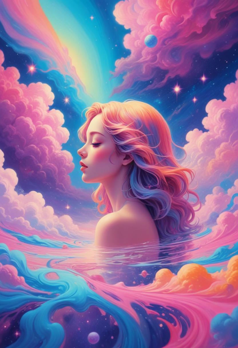 A serene woman with flowing hair floats in cosmic waters, surrounded by colorful clouds and starry skies, evoking a dreamlike vibe.