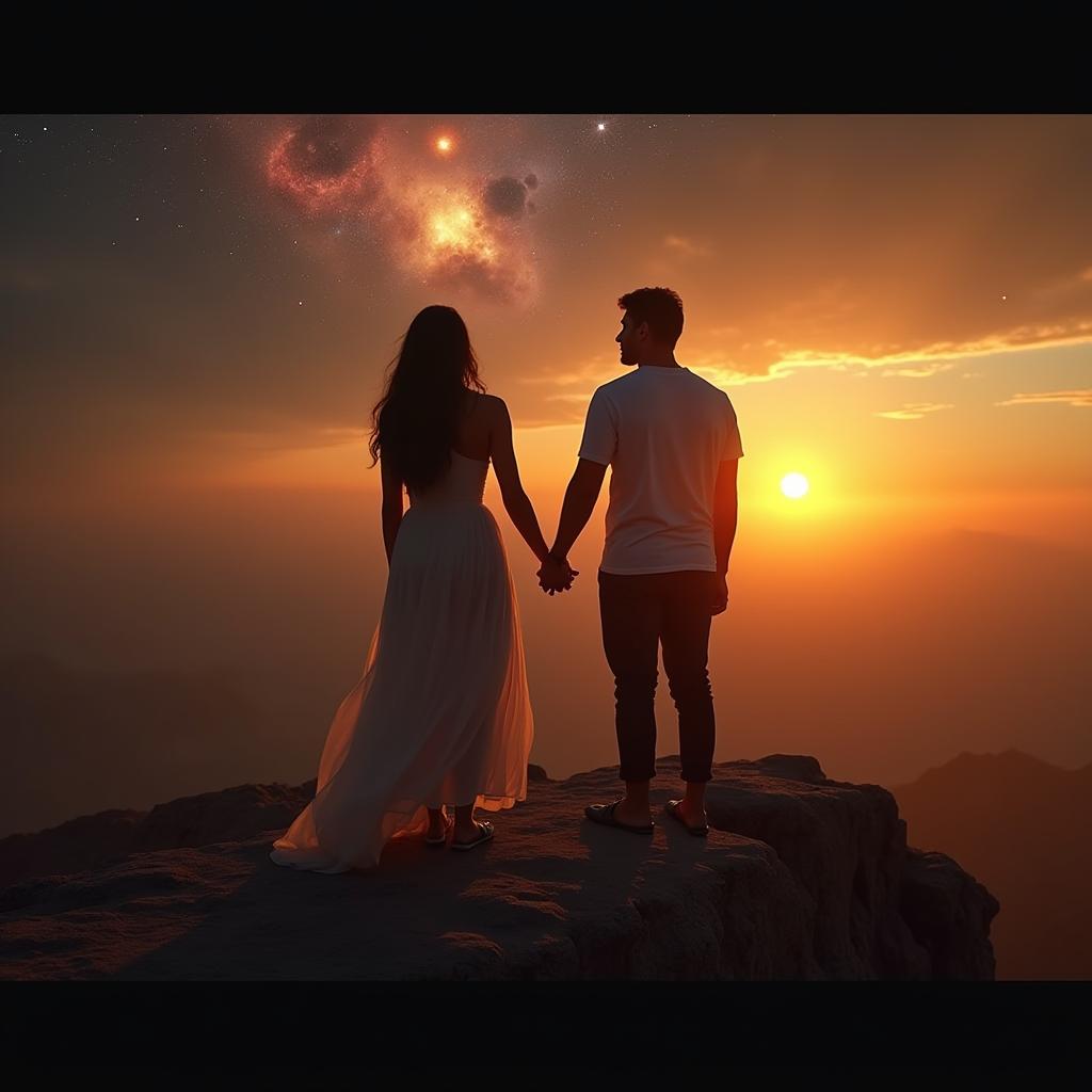 A couple stands hand in hand atop a mountain during sunset, surrounded by a stunning cosmic backdrop as the sun sets.