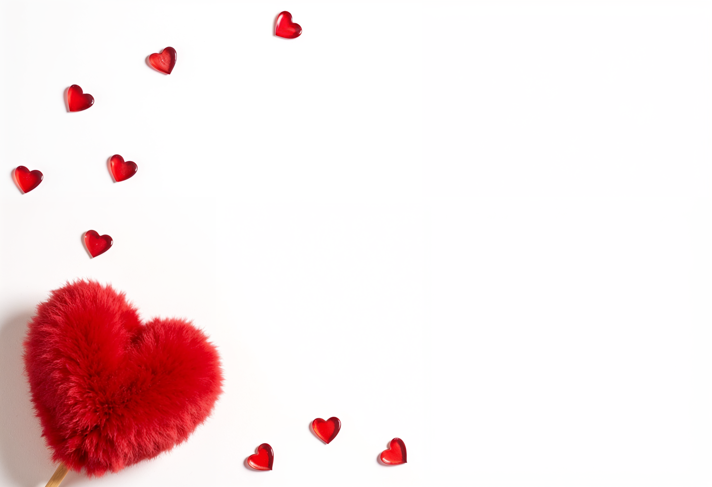 A large fluffy red heart held in one hand is surrounded by smaller red hearts on a bright white surface, creating a festive atmosphere.