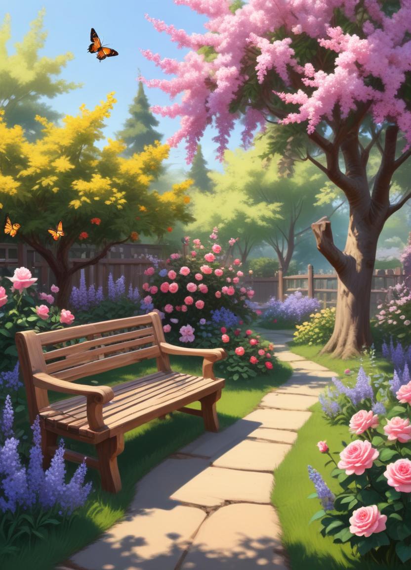 bench, blooming, blossom, butterflies, colorful, flowers, garden, landscaping, nature, outdoor, path, peaceful, relaxation, scenery, shrubs, spring, sunlight, tranquil, trees, wildlife