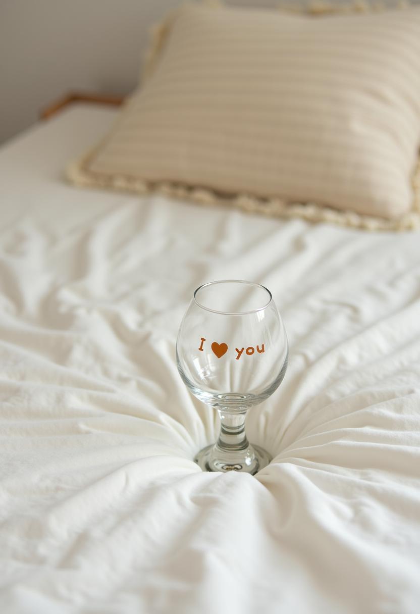 A glass inscribed with a love message is placed on a beautifully made bed featuring white linens and a cozy pillow.