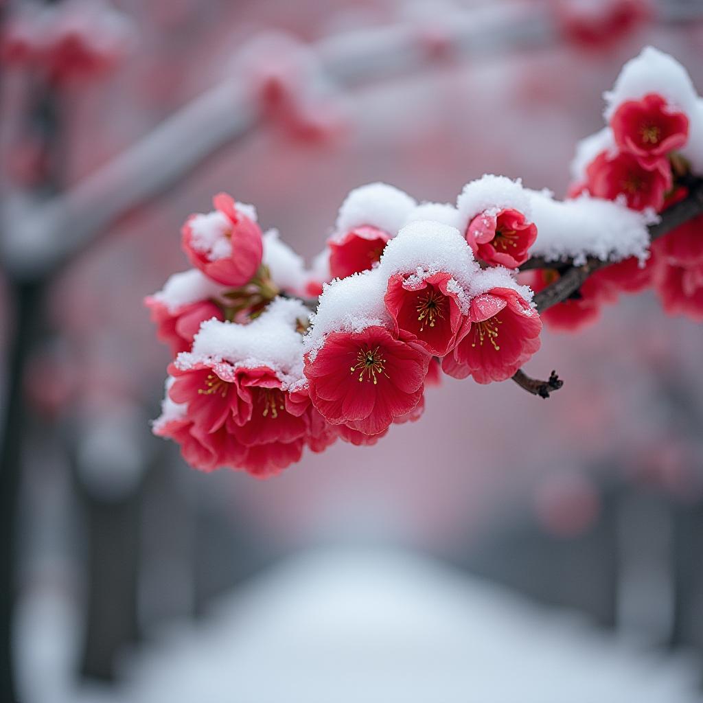 A branch of vibrant pink cherry blossoms is blanketed with fresh snow on a cold winter day, creating a striking contrast in nature.