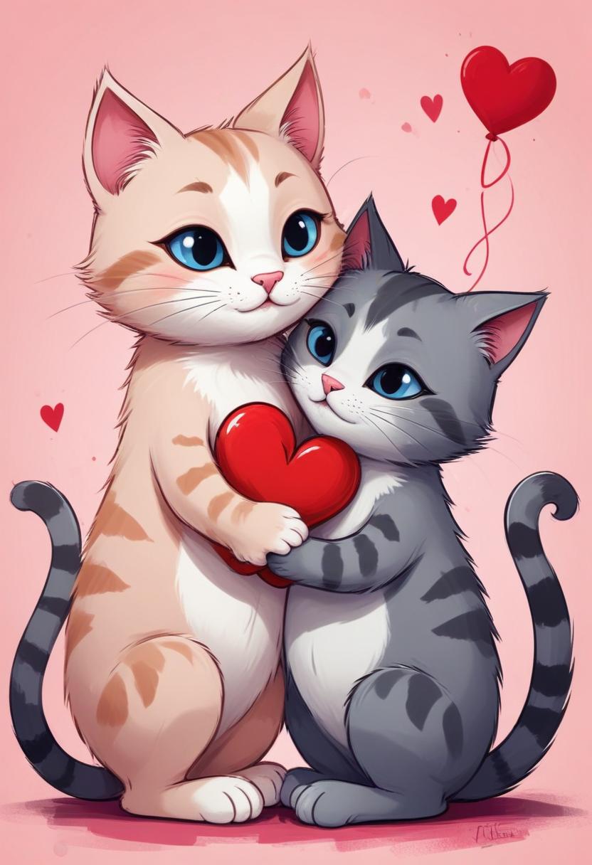 adorable, affection, artwork, background, cartoon, cats, character, cute, gray, heart, hugging, illustration, joyful, love, orange, pets, pink, playful, romance, sweet