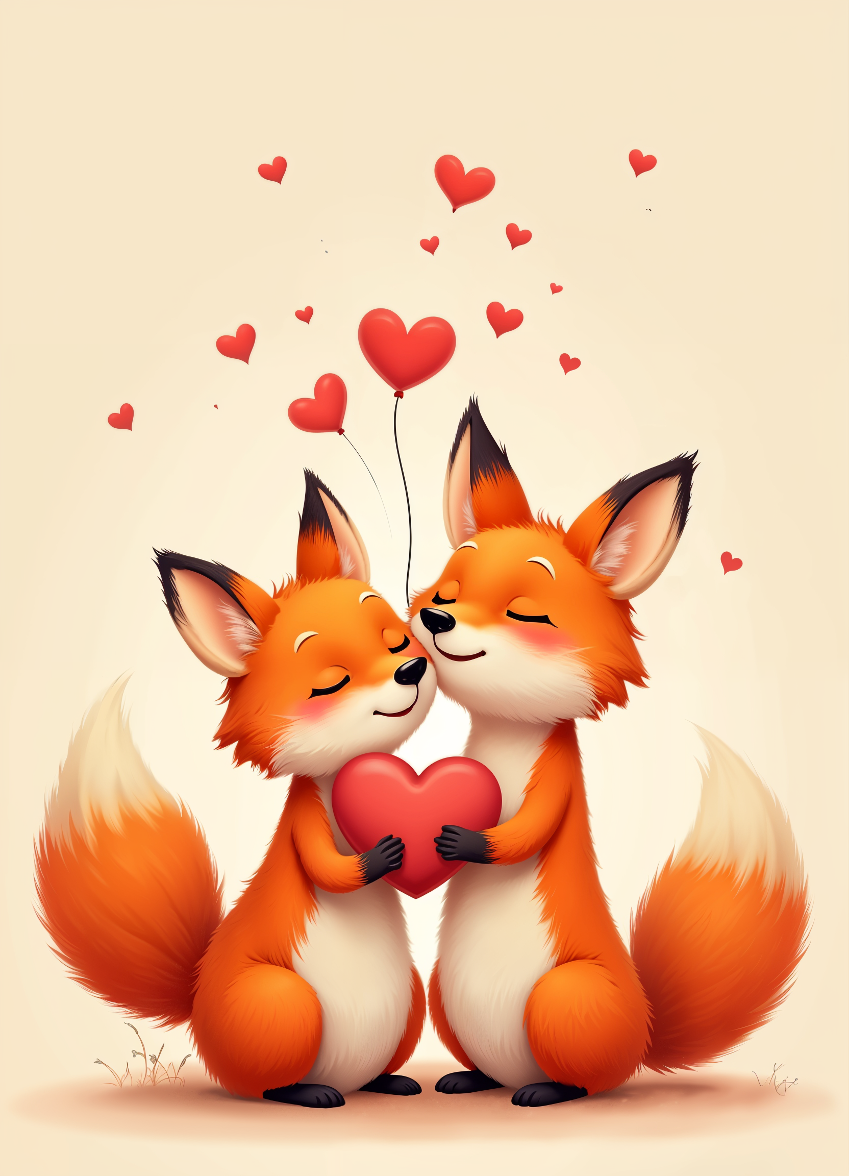 Two adorable foxes stand close, exchanging affection while holding a heart amidst floating red hearts in a soft background.