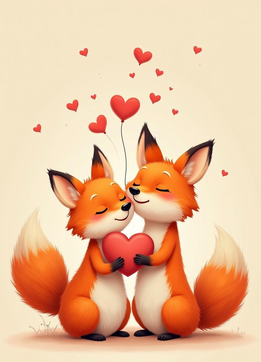 Cute fox couple sharing a loving embrace with hearts