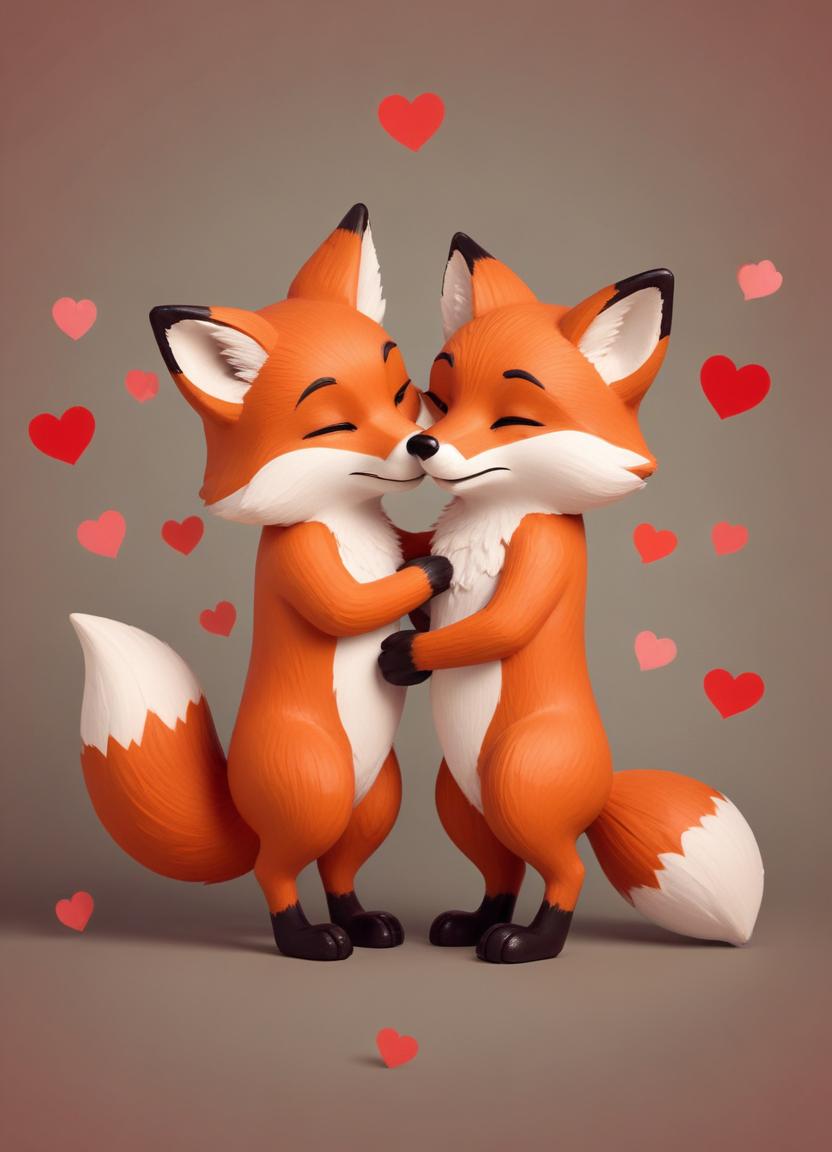 Two adorable fox characters are hugging each other, surrounded by colorful hearts, symbolizing love and affection in a playful way.