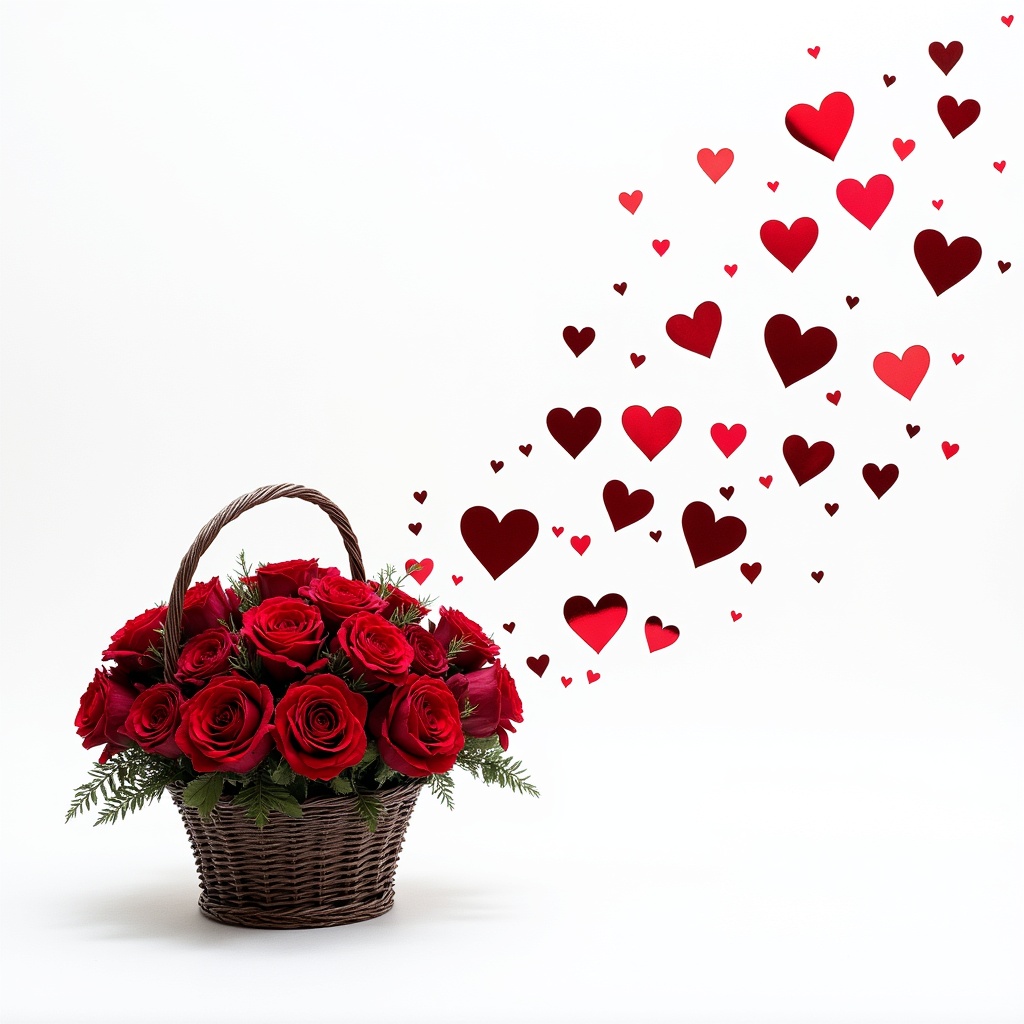A wicker basket filled with vibrant red roses releases numerous hearts into the air, creating a romantic and joyful atmosphere.