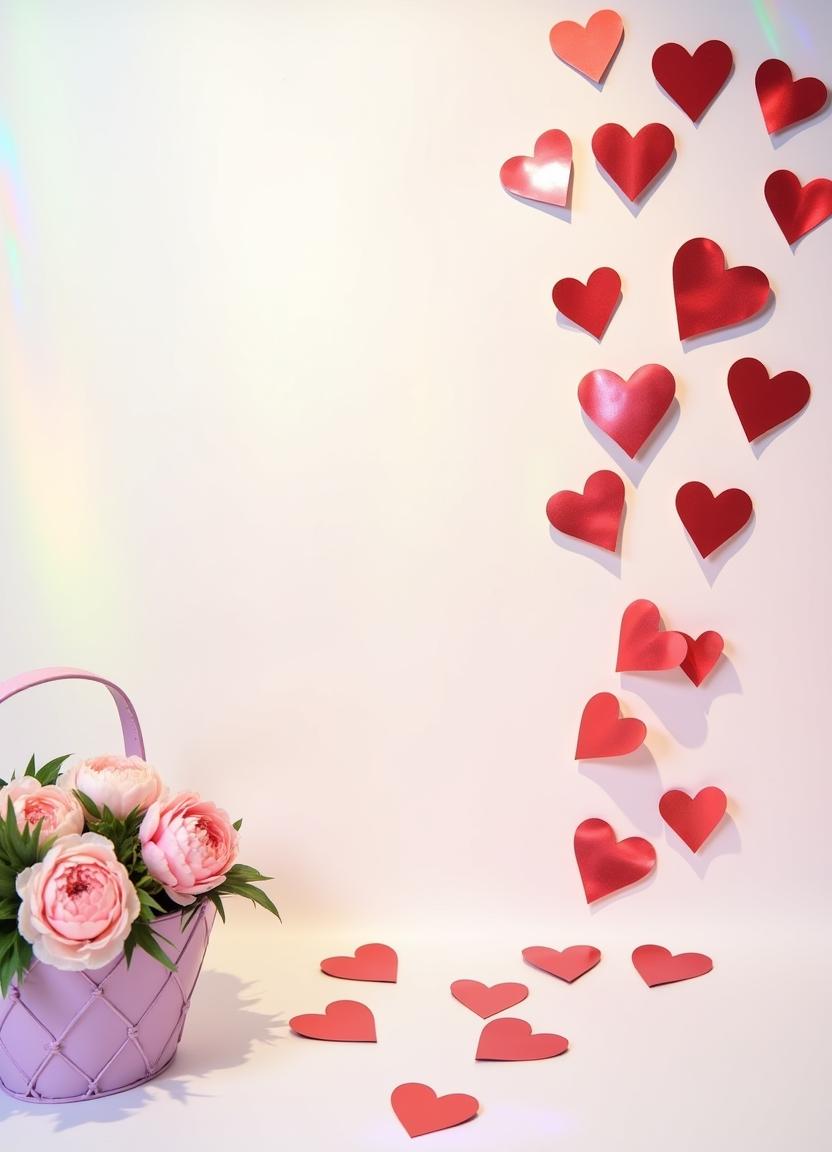 A pink basket filled with peonies sits beside scattered red hearts, creating a romantic atmosphere ideal for special occasions.