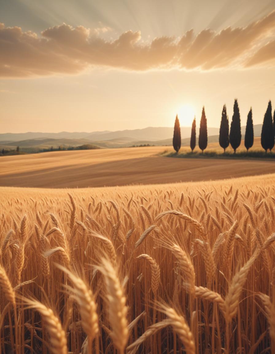 Italy, Tuscany, agriculture, crops, farming, fields, golden, harvest, hills, horizon, landscape, nature, outdoors, rural, scenery, sky, sunlight, sunset, tranquility, wheat