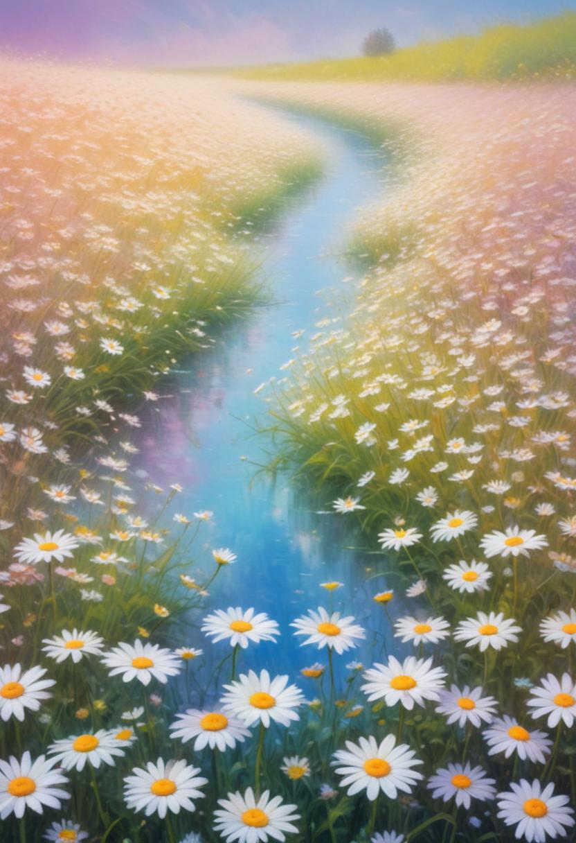 A tranquil river winds through a vibrant field filled with blooming daisies under soft morning light, creating a peaceful atmosphere.