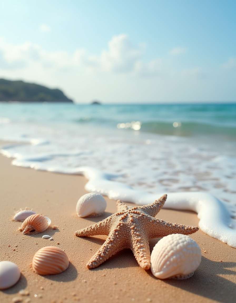 A large starfish lies on sandy beach surrounded by various seashells including white and orange conch shells. Gentle ocean waves crash nearby under a clear blue sky with distant green hills. The scene features a serene tropical shoreline with scattered seashells.