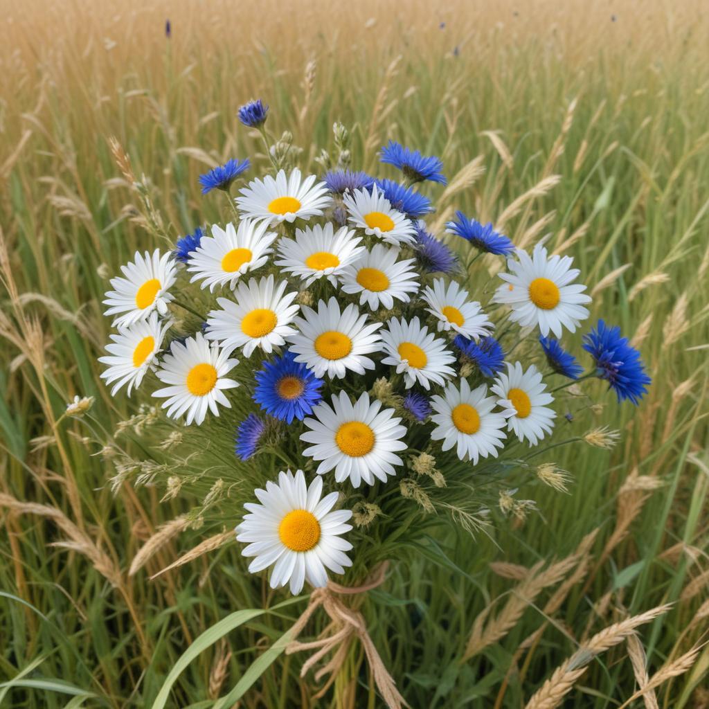 A vibrant bouquet of daisies and blue cornflowers stands out against a background of tall green grass on a sunny day.