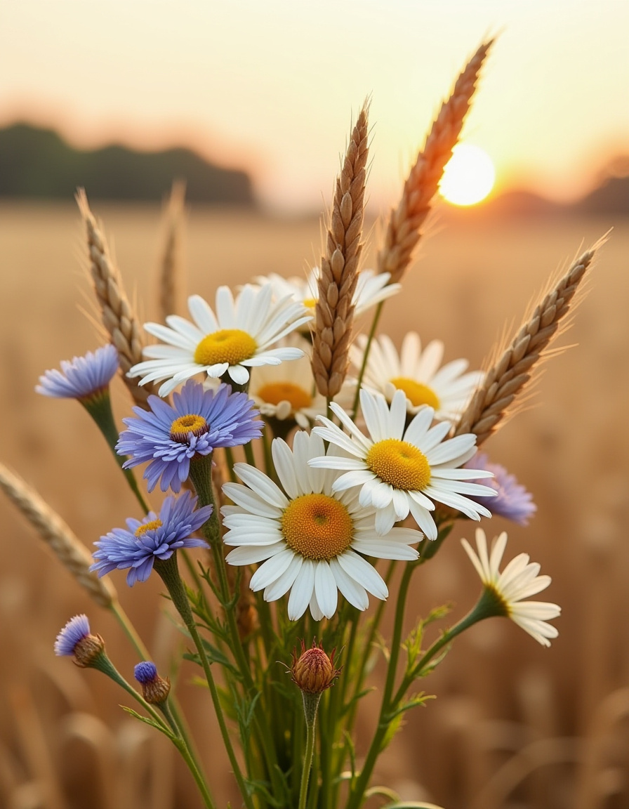 A bouquet of daisies and wildflowers stands amid golden wheat fields as the sun sets, creating a serene and picturesque atmosphere.