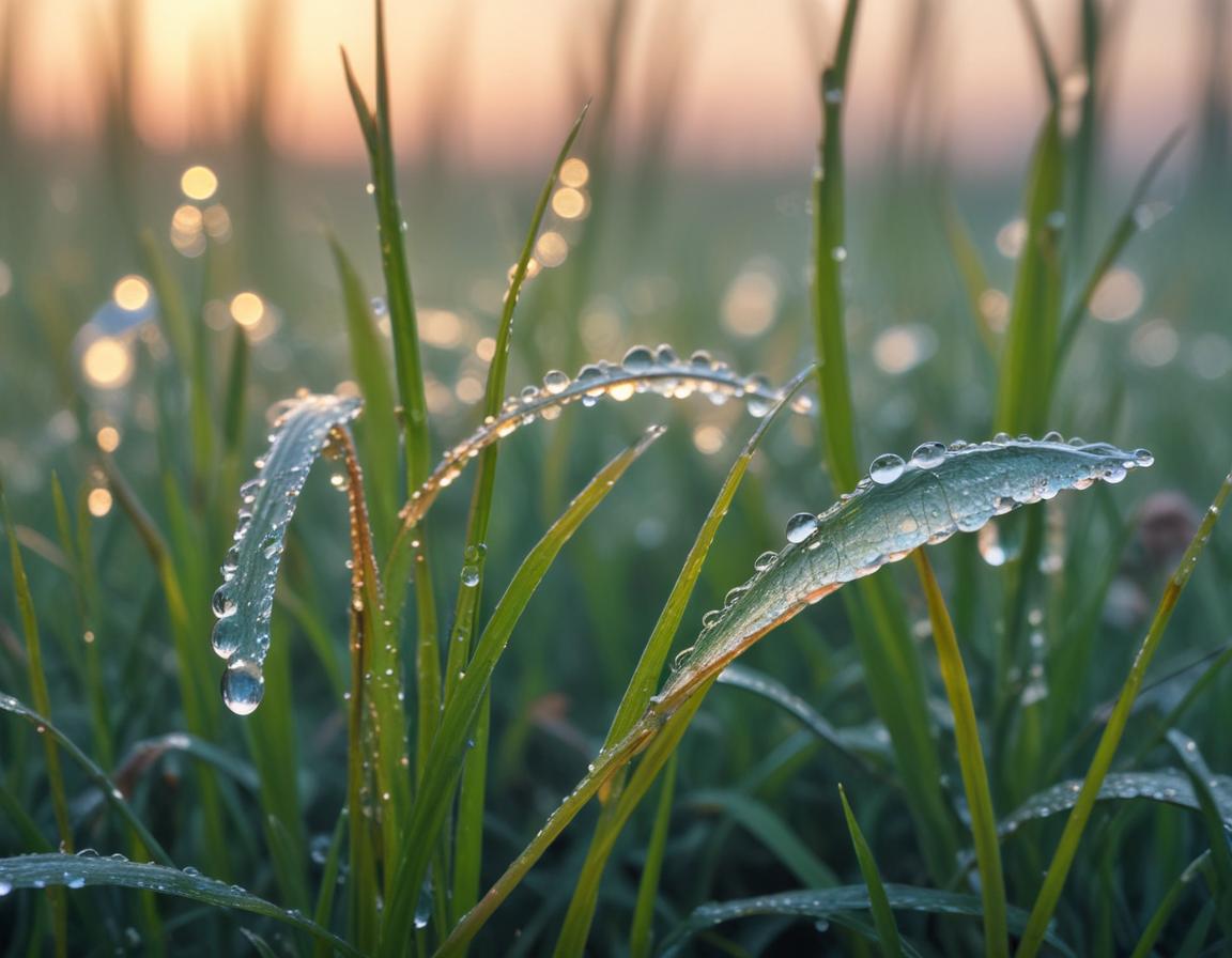Morning sunlight casts a golden hue on grass blades adorned with sparkling dew drops, creating a serene natural atmosphere.