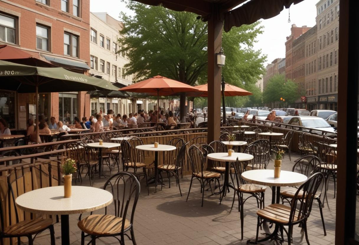 al fresco, beverages, bustling, cafe, cafe terrace, city, dining experience, eating, greenery, leisure, outdoor dining, patio, people, relaxed atmosphere, restaurant, socializing, summer, sunny, tables, urban