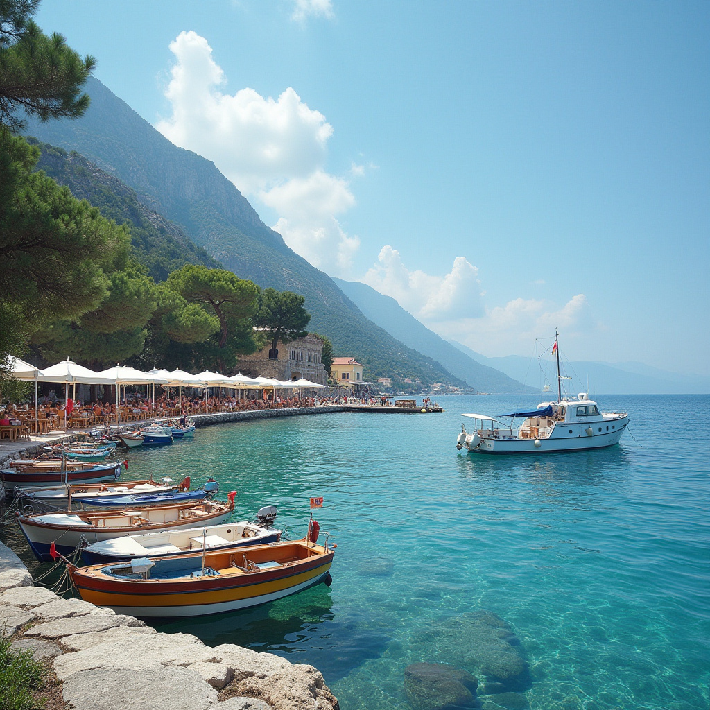 beachside restaurant, boats, clear water, coastal view, harbor, landscape, marina, mountains, nature, outdoor dining, relaxation, scenery, seaside, summer, sunny day, tranquil, travel, turquoise sea, vacation, waterfront
