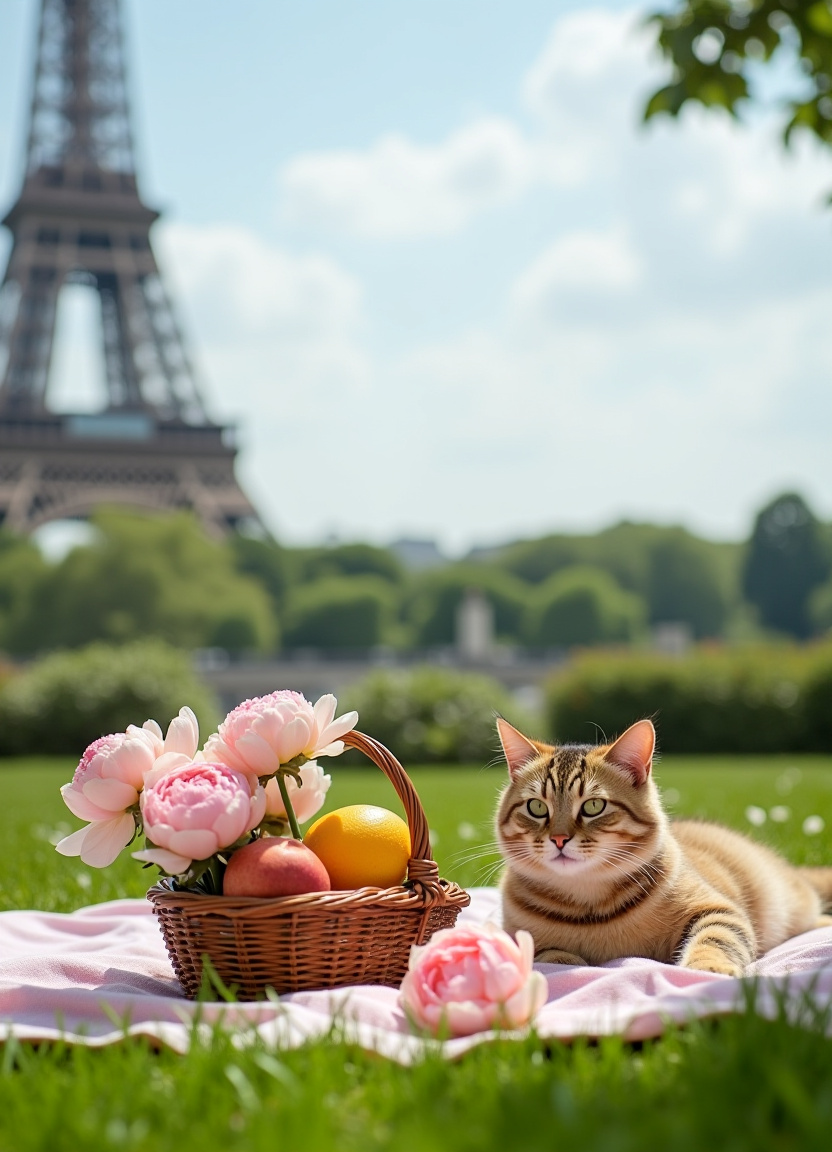 A tabby cat lies on a pink blanket on green grass with a wicker basket of fruits and pink peonies nearby. The Eiffel Tower stands prominently in the background under a clear blue sky. Lush green trees and gardens frame the scenic outdoor picnic setup.