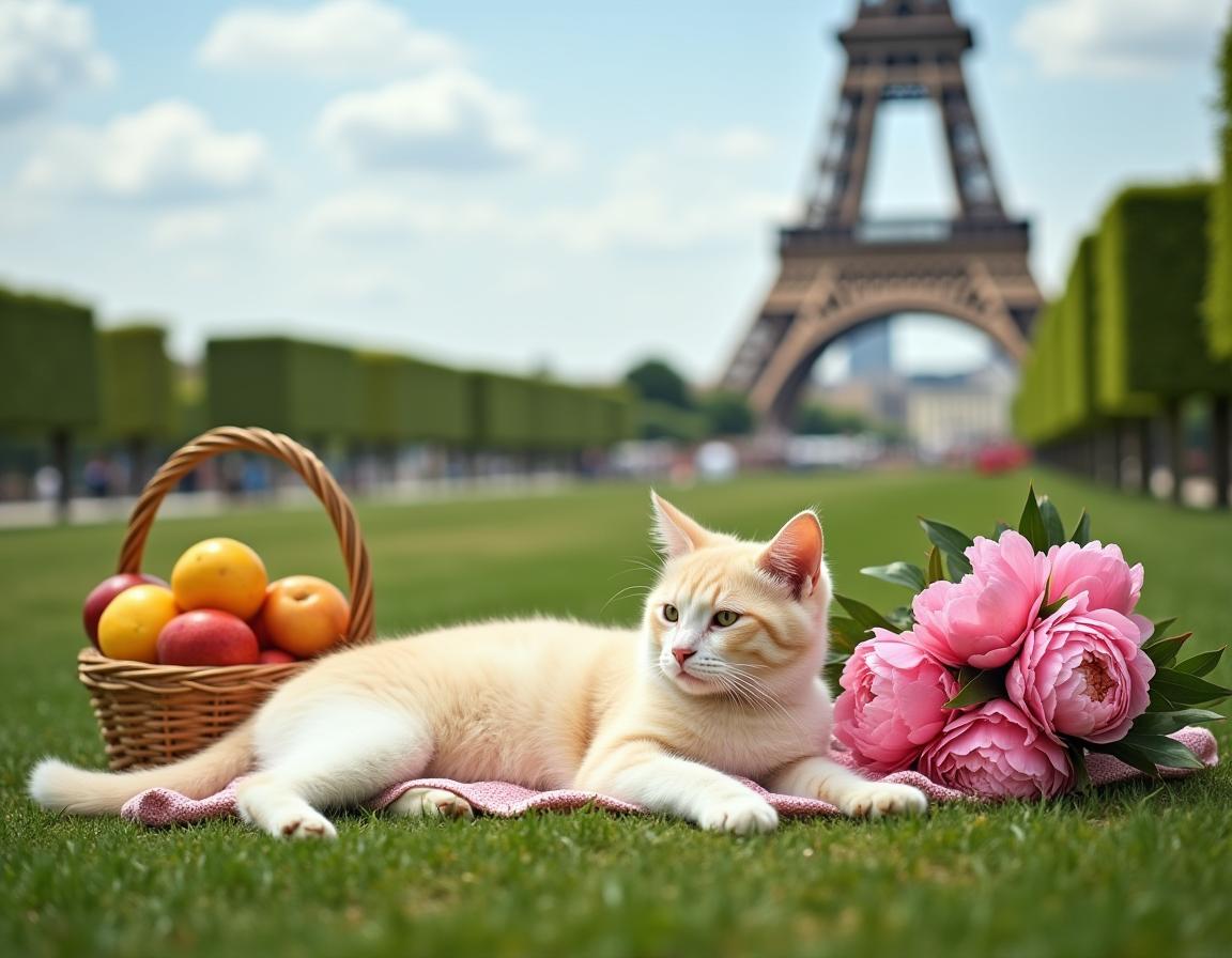 Eiffel Tower, France, Paris, apples, cat, cream cat, cute kitten, feline, flowers, fluffy cat, grass, green grass, hedges, landmark, orange kitten, outdoor, pet, picnic basket, pink peonies, red apples, sunny, wicker basket, young cat, kitten