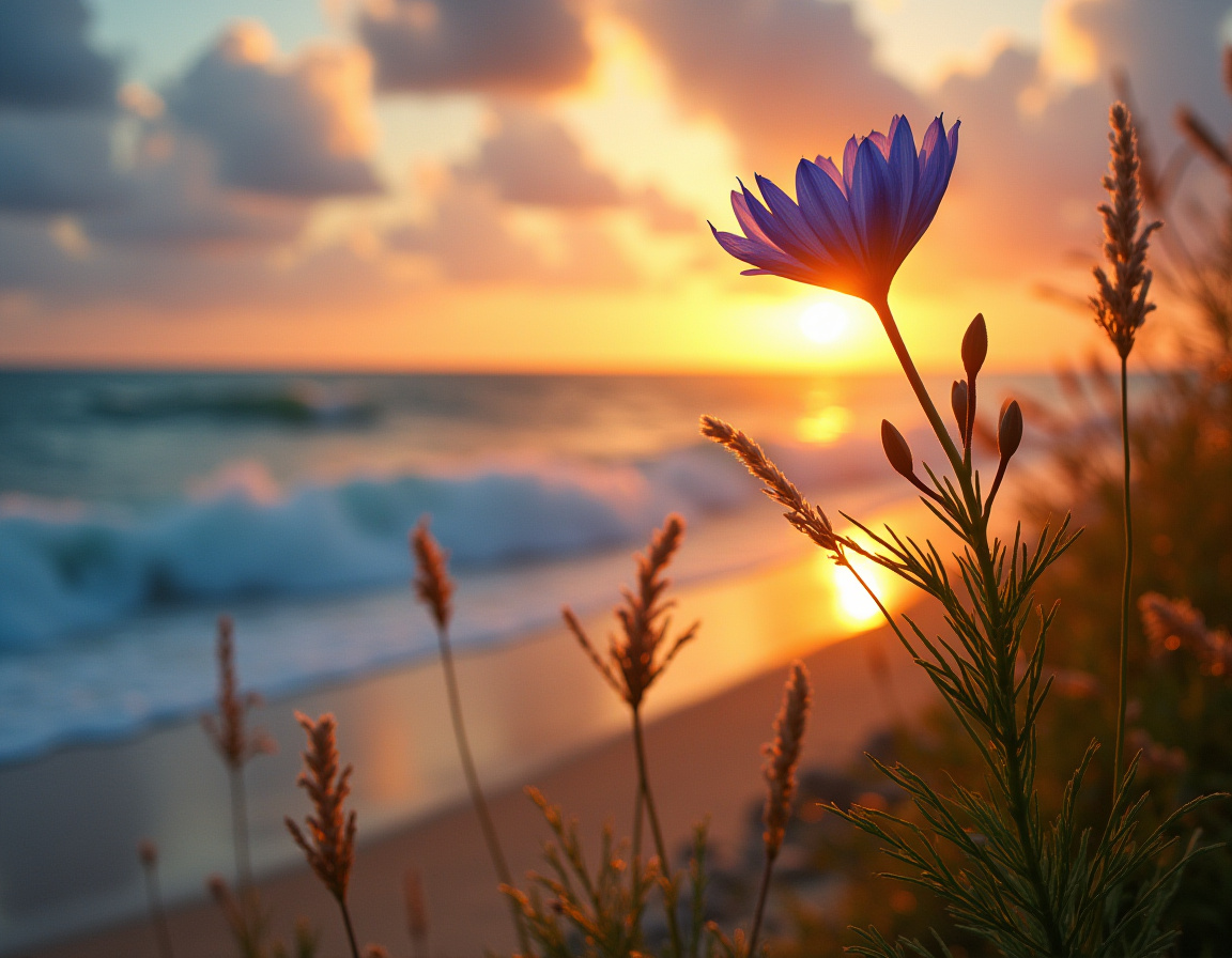 beach, bloom, bokeh, clouds, coast, flora, flower, golden hour, grass, horizon, isolated background, nature, ocean, orange sky, petals, sand, sea, seaside, shore, sky, stem, sunlight, sunset, vibrant, waves, blue flower