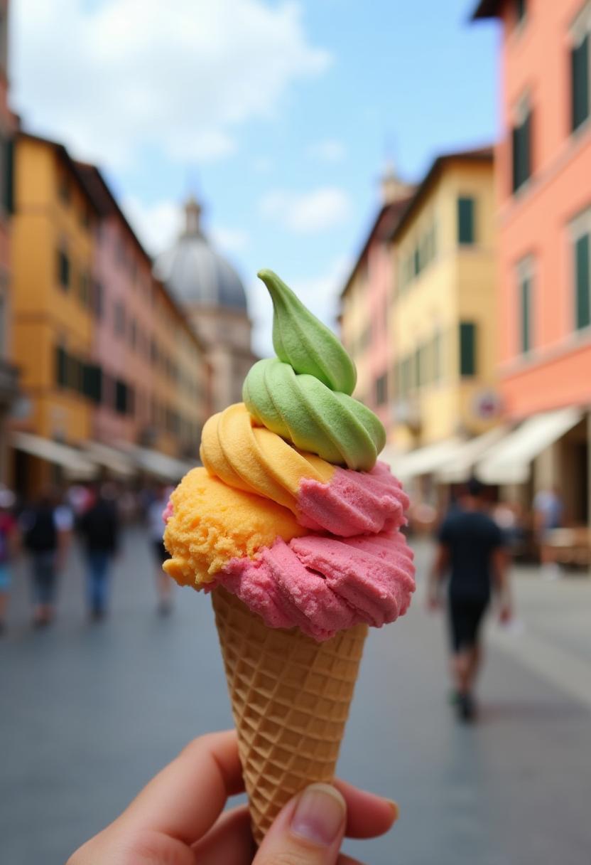 Europe, Italian street, blue sky, clouds, cobblestone street, colorful ice cream, cone, domed cathedral, gelato, green ice cream, hand holding, historic architecture, orange buildings, orange ice cream, pedestrians, pink ice cream, street food, summer treat, travel, triple scoop, vacation, waffle cone, ice cream