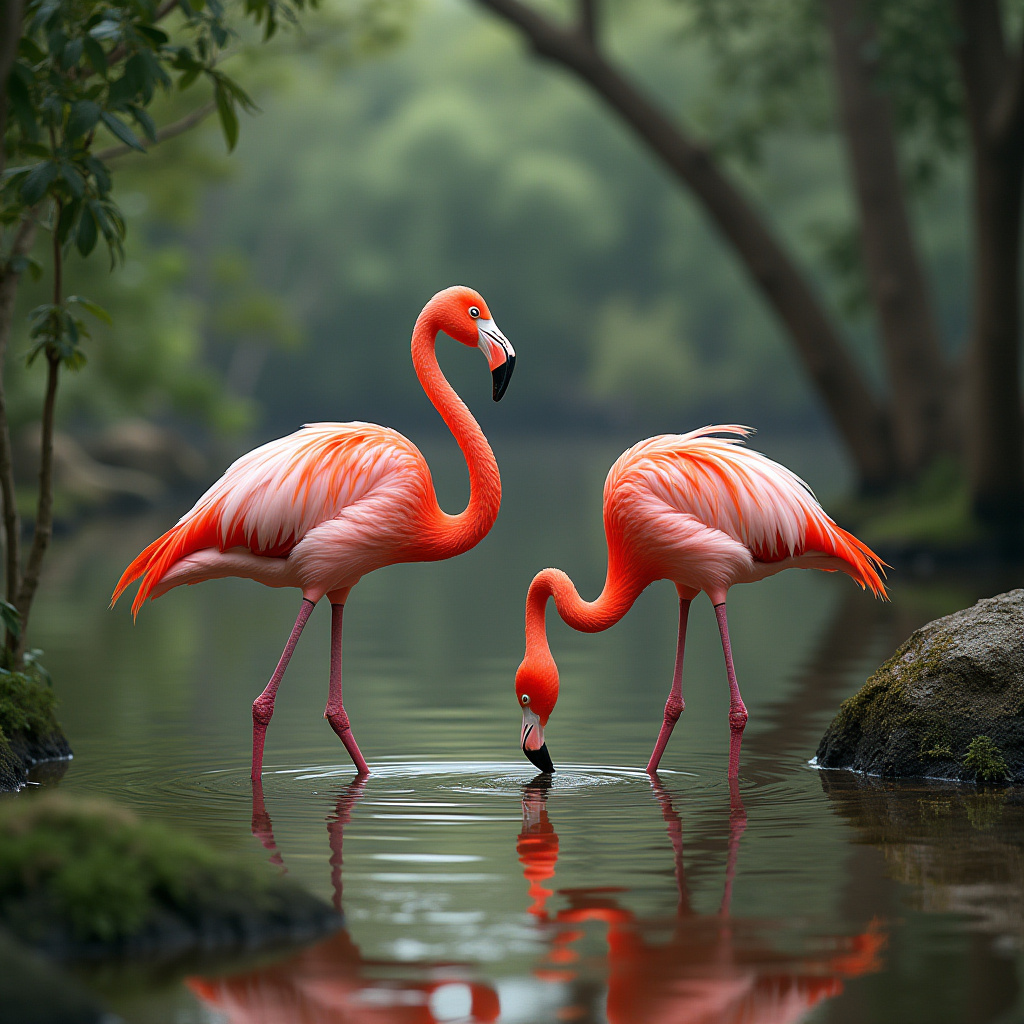 animals, avian, birds, curved necks, feathers, flamingo pair, forest background, green foliage, kissing flamingos, long legs, misty, nature, neck touch, pink flamingos, reflection, rocks, shallow water, tropical, two flamingos, water, wildlife, flamingos
