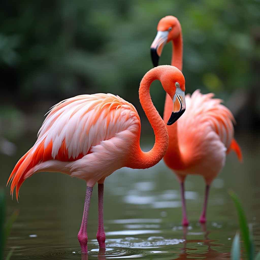 animals, birds, black beak tips, curved necks, green water, long legs, lush greenery, nature, orange beaks, pink flamingos, shallow water, tropical birds, two flamingos, vegetation, wading birds, water, wildlife, flamingos