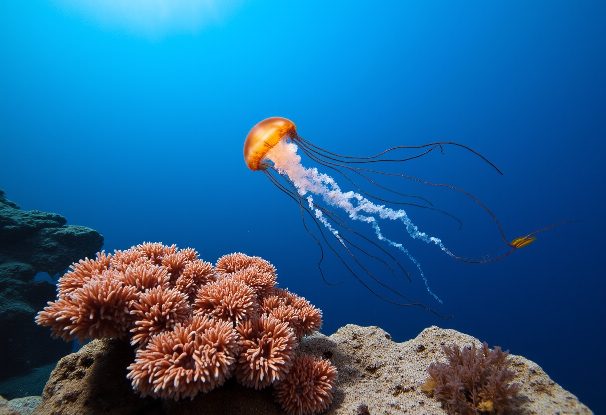 aquarium, aquatic, blue water, coral polyps, coral reef, deep sea, isolated background, jellyfish swimming, marine life, nature, ocean, ocean creature, orange jellyfish, pink coral, rock, sea, sunlight, tentacles, underwater, wildlife, jellyfish
