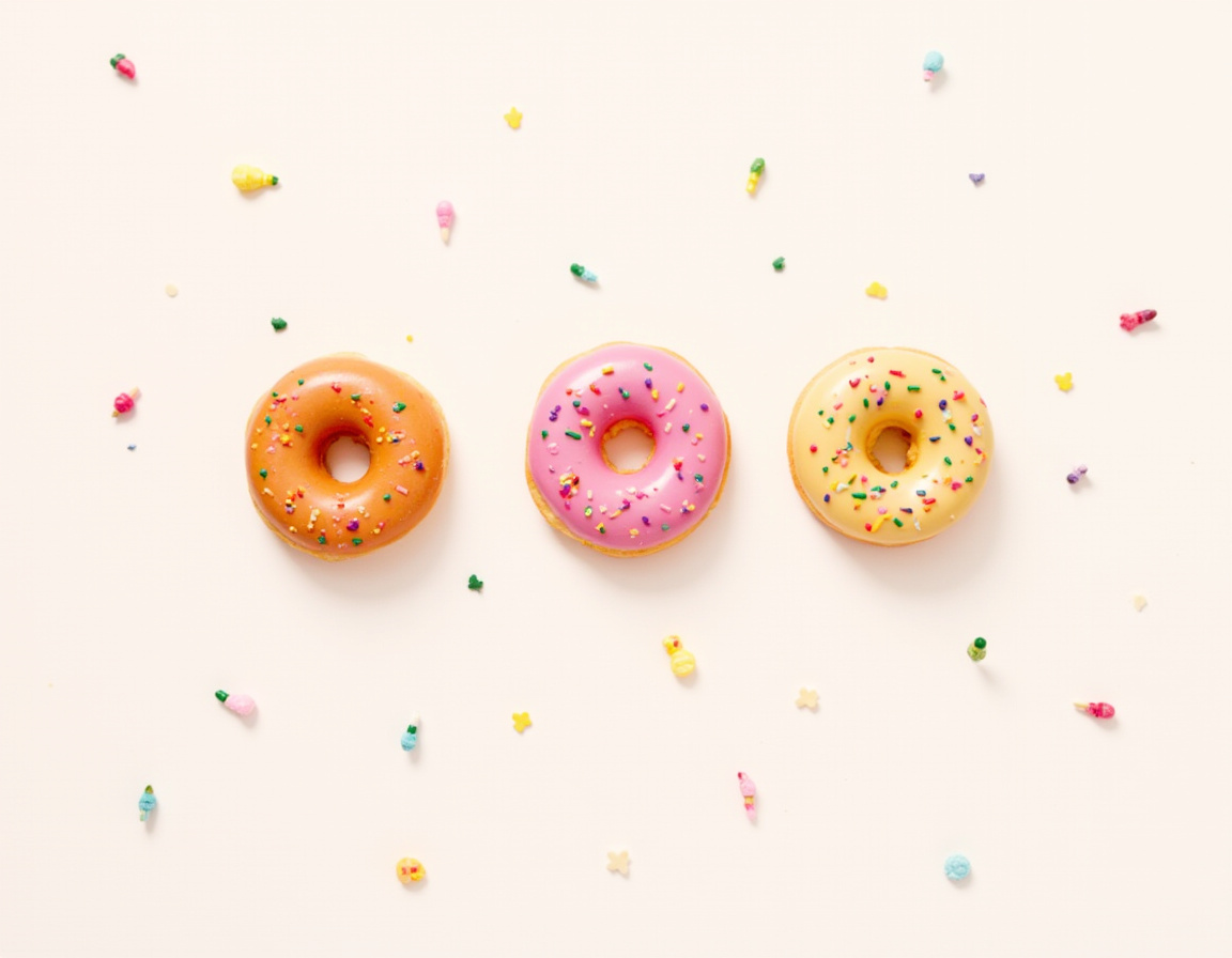 Three rubbery donuts in orange, pink, and yellow with colorful sprinkles sit on a light pink background. Sprinkles are scattered around and on top of the glossy donuts. The arrangement is flat lay style with isolated background.