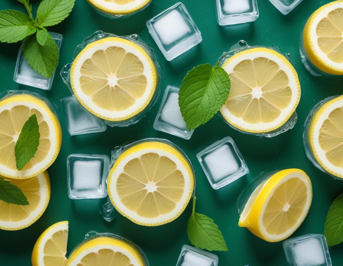 Fresh lemon slices are arranged on a green background with ice cubes and mint leaves scattered throughout. The lemons are cut open to reveal juicy yellow interiors. The composition creates a refreshing flat lay display.