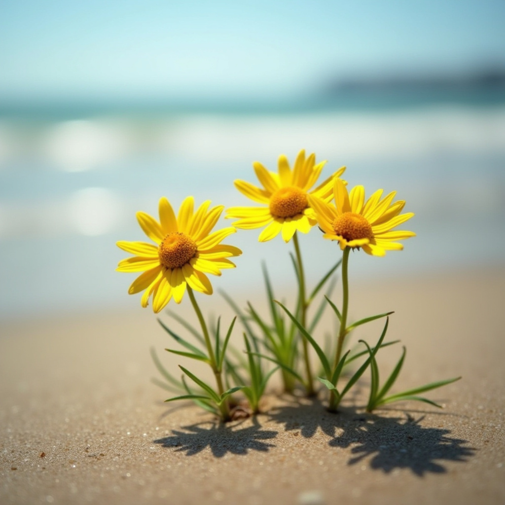 beach, beauty, blooming, coastline, flora, flowers, growth, nature, ocean, outdoor, petals, plants, sand, scenery, summer, sunlight, sunshine, tranquility, waves, yellow