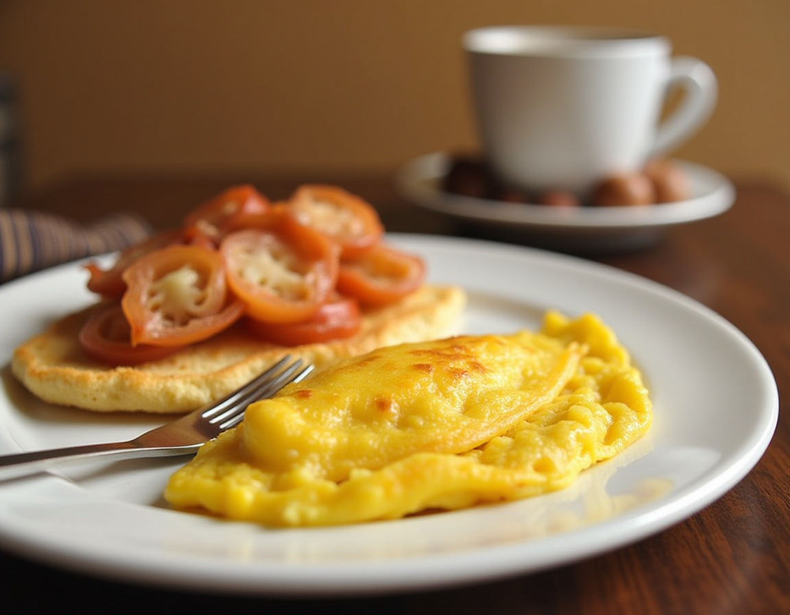 A hearty breakfast plate showcasing a fluffy omelette alongside sautéed tomatoes, with coffee in the background, all served on a wooden table.