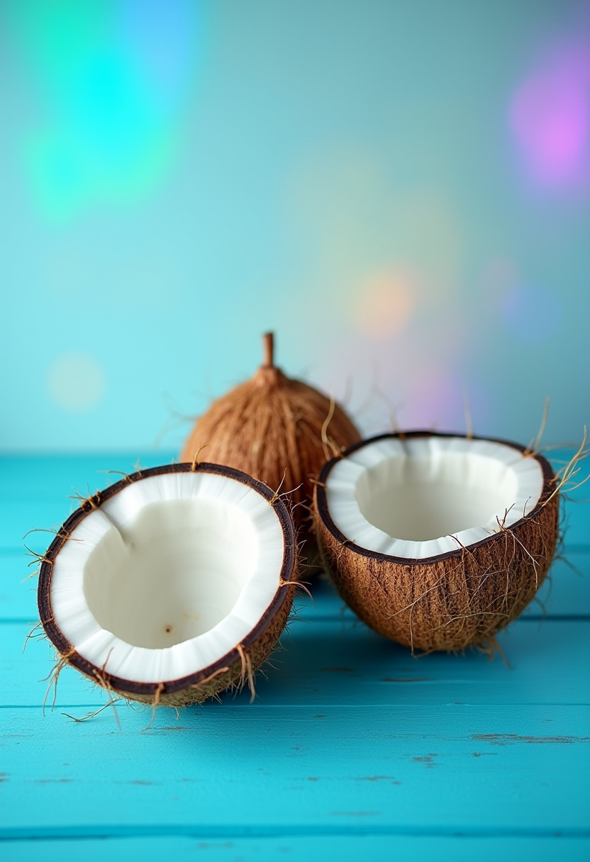 Whole and halved coconuts rest on a bright blue wooden surface, showcasing their textured shells and creamy interiors, creating a fresh atmosphere.
