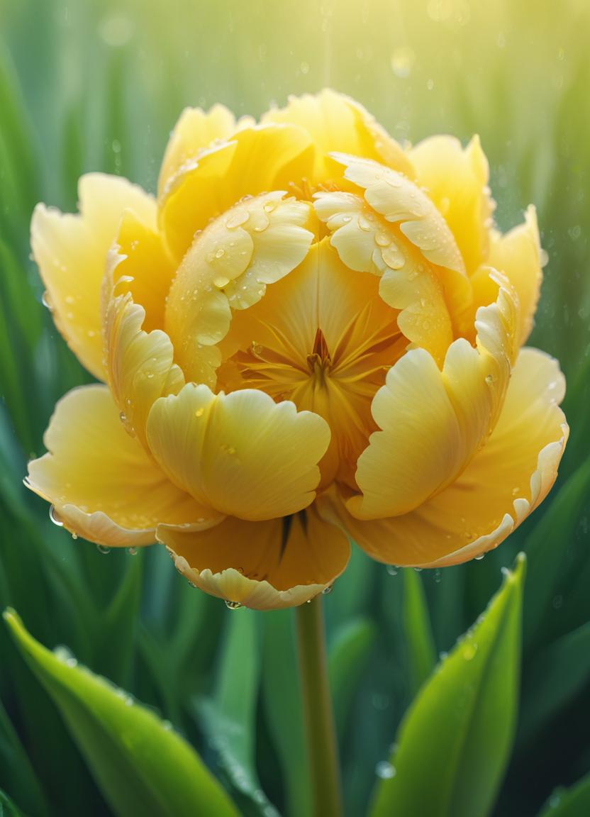 A stunning yellow tulip opens its petals, glistening with dew in the gentle morning sun, surrounded by lush green leaves.