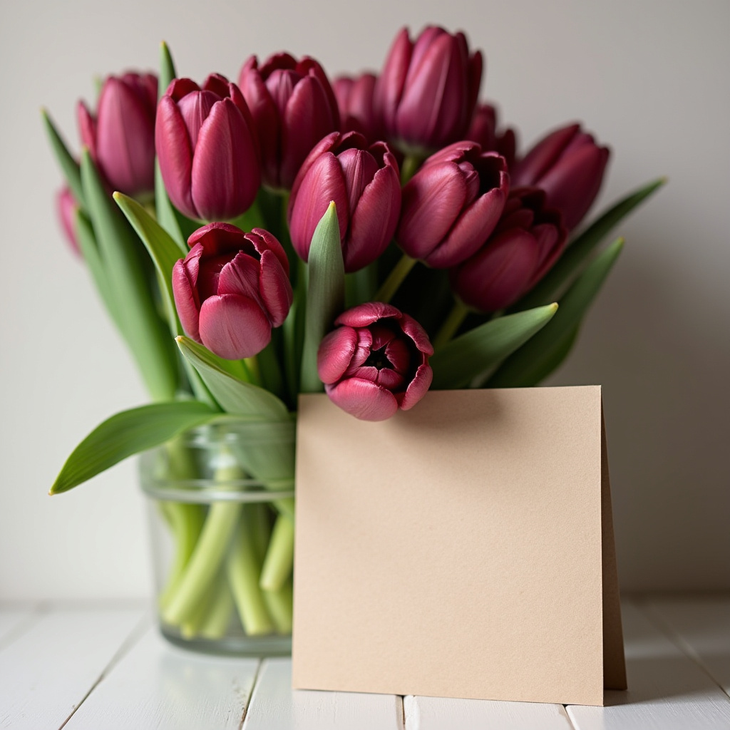 Bright purple tulips are arranged beautifully in a clear jar, with a blank card resting beside them. Ideal for gifting or decoration.