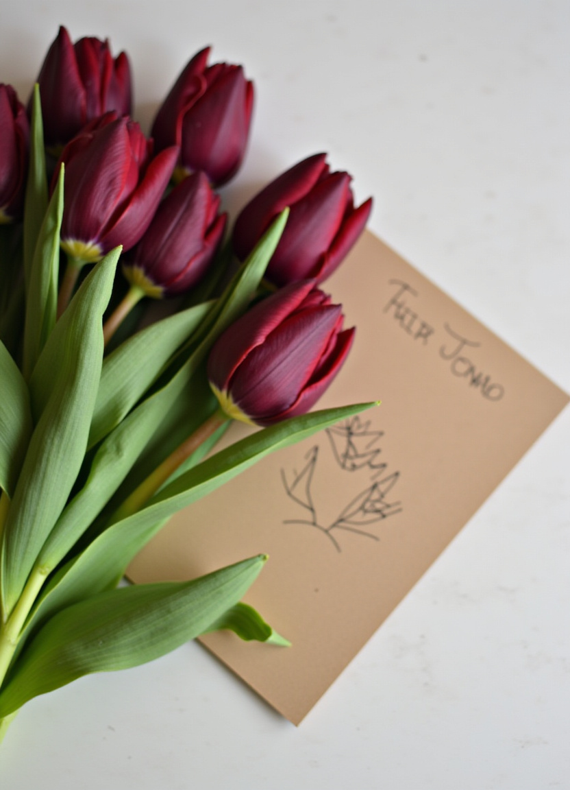 Fresh red tulips rest beside a personalized note on a light surface, creating a warm and inviting atmosphere perfect for any occasion.