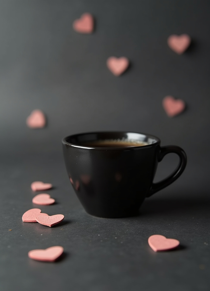 A black cup filled with coffee sits on a dark surface, scattered pink heart shapes create a romantic atmosphere.