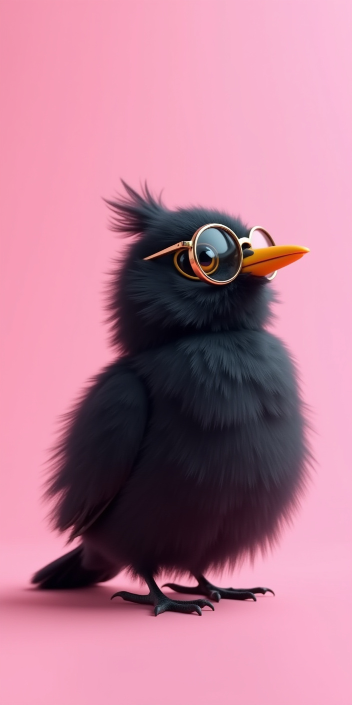 animal, animation, black bird, cartoon, character, colorful, cute, fluffy, fun, glasses, nature, personality, pet, pink background, pose, round eyes, social media, stylish, whimsical, wildlife