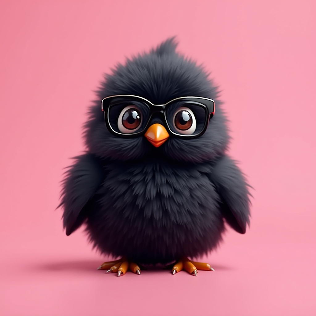 A small, fluffy bird stands confidently on a pink background, sporting oversized black glasses. Its bright eyes add charm to the scene.