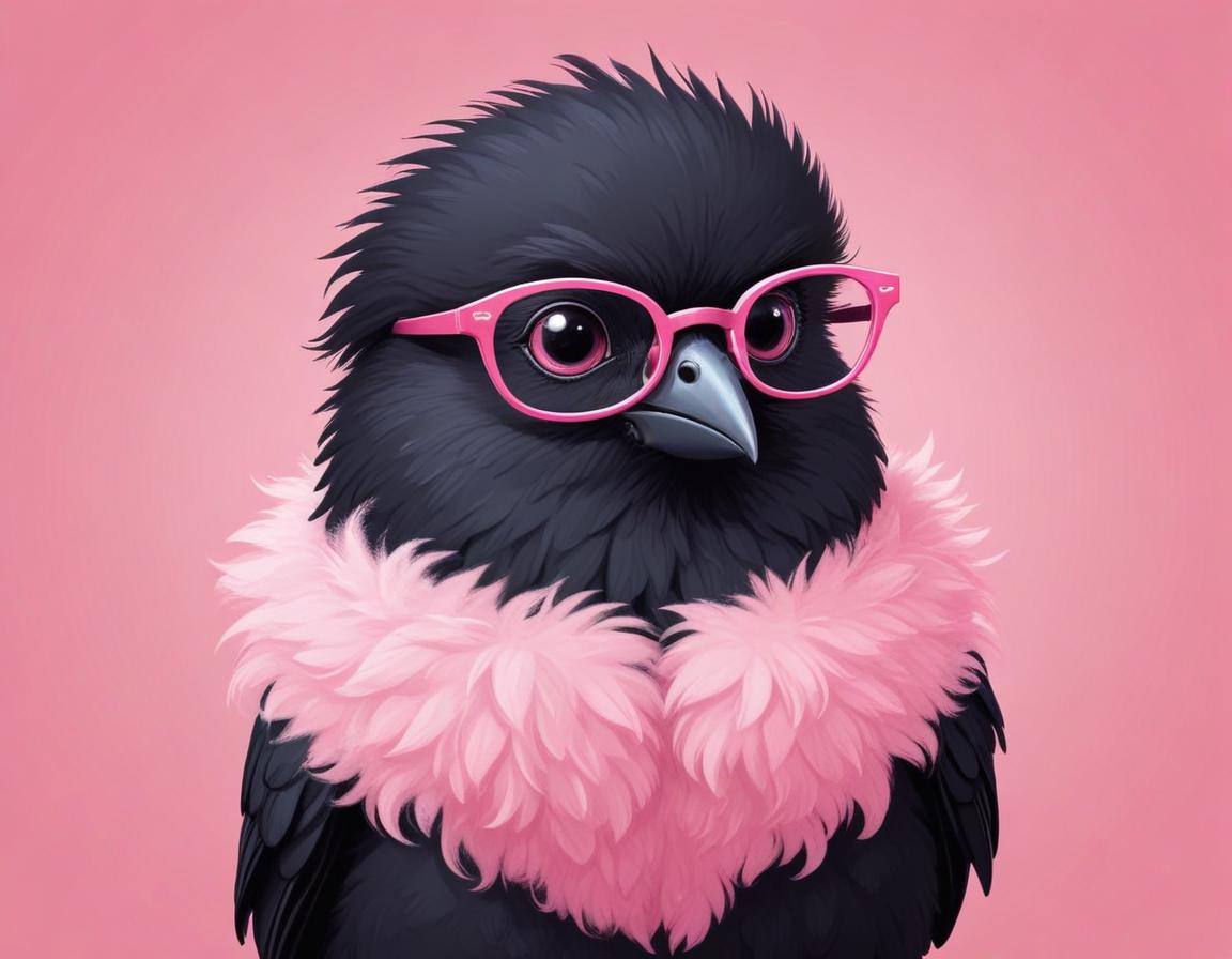 A charming black bird wears pink glasses and a fluffy pink collar, striking a pose against a soft pink background.