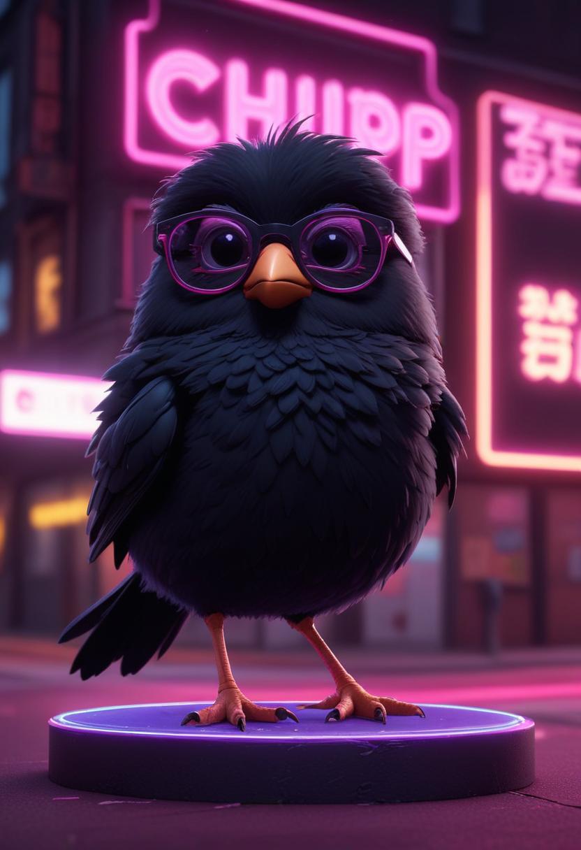animal, bird, black, bright colors, character design, city, cityscape, confident, creative, cute, fantasy, glasses, neon lights, night, personality, platform, small, stylish, urban, whimsical