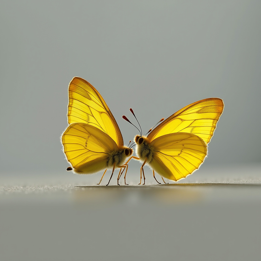 Two vibrant yellow butterflies engage in mating behavior on a smooth surface, showcasing their beautiful wings and delicate features.