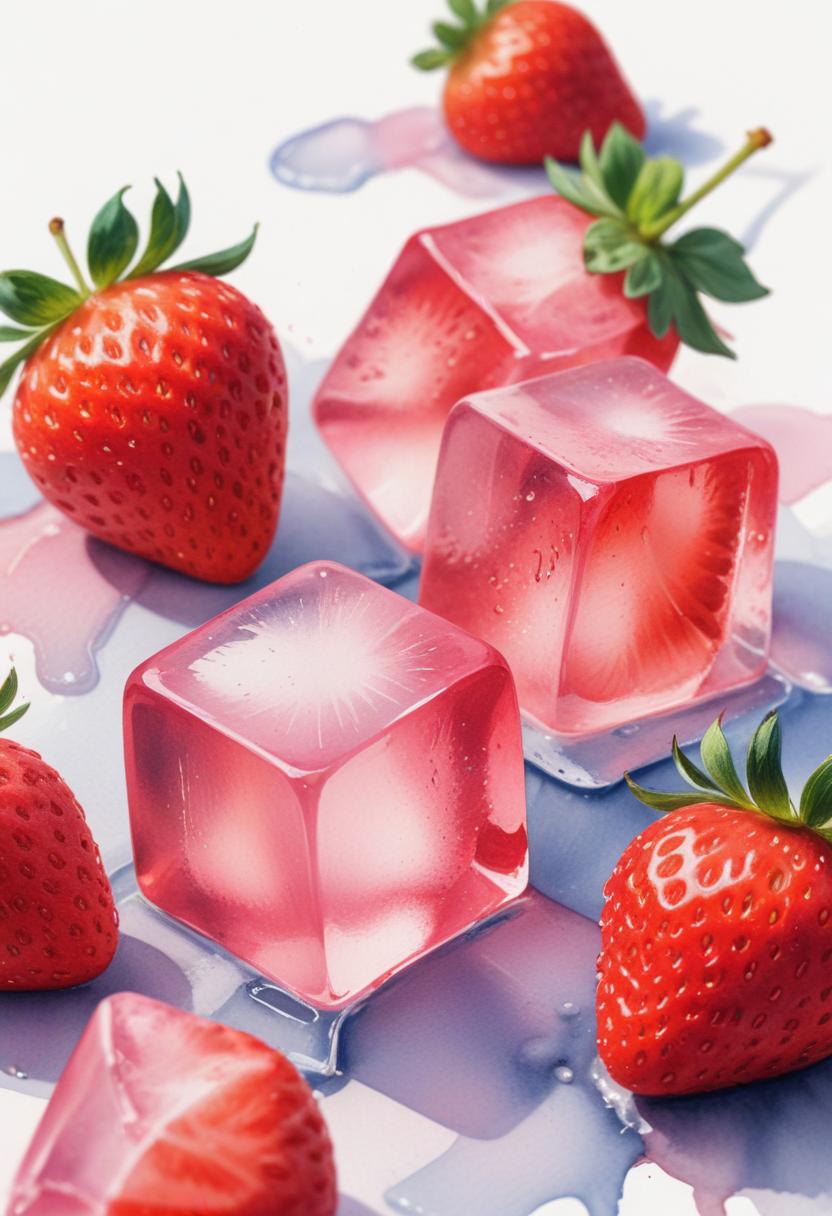 Bright red strawberries and clear ice cubes create a visually appealing arrangement, evoking a sense of refreshment and summer vibes.
