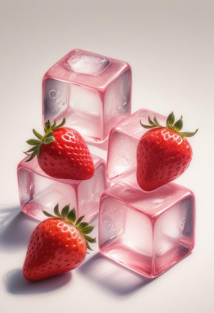 Bright red strawberries are placed on top of glistening pink ice cubes, combining fresh fruit and a playful coolness in a creative arrangement.