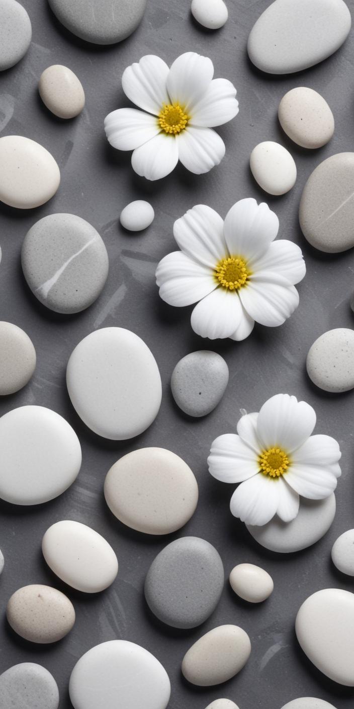 arrangement, beauty, calming, composition, decor, design, elegance, flat lay, floral, flowers, gray background, minimalism, nature, peaceful, pebbles, serenity, simple, stones, texture, white