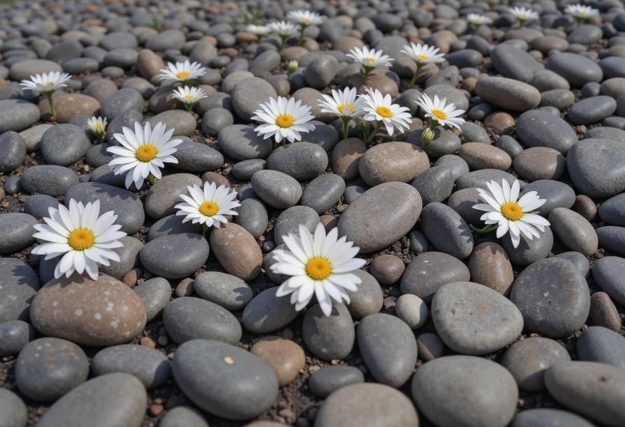 White daisies with yellow centers emerge through gray pebbles in a tranquil landscape, highlighting nature's resilience and beauty.